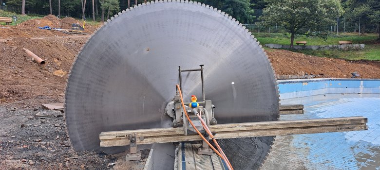 (Die Spezialsäge "frisst" sich in den Beckenrand)