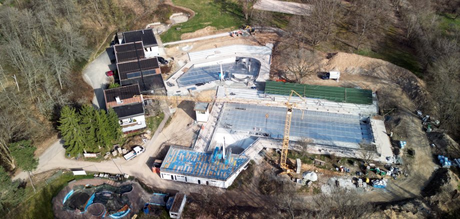 (Schwimmerbecken mit Sitzstufen und PV-Anlage auf der Überdachung im März 2026 - mittlerweile ist dieser Bauabschnitt fertig! Foto: Jochen Haupt, "Niedernhausen Info")