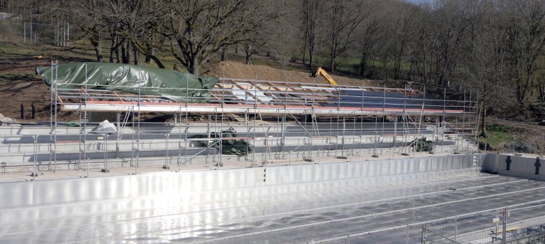 Tatsächlich sind die Arbeiten in den letzten Wochen gut vorangekommen. Frost, Schnee und Regen hatten den ganzen Winter über gebremst. Einige Arbeiten, zum Beispiel an der Überdachung der Sitzstufen, waren auf anhaltend frostfreie Temperaturen angewiesen, damit bestimmte Spezialbetonarten aushärten können. Auch die verschiedenen Gewerke mussten aufeinander abgestimmt werden – und wie man sich vorstellen kann, geht das nicht immer reibungslos!