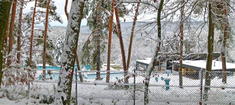 Wenn der erste Schnee fällt (wie in Niedernhausen vor zwei Wochen) versinkt das Waldschwimmbad eigentlich in einen tiefen Winterschlaf. Die Kolleginnen und Kollegen führen Wartungsarbeiten durch oder feiern ihre in der Badesaison gesammelten Überstunden ab. Ein paar Vögel sind die einzigen „Badegäste“… So sah es letztes Jahr um diese Zeit „dort oben“ aus: