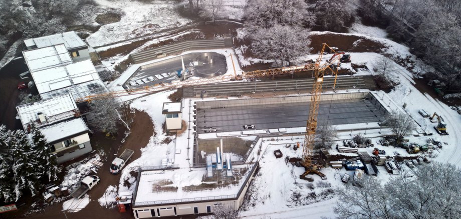 Auch für die letzten Arbeiten am Flachdach des Technikgebäudes ist frostfreies Wetter erforderlich. Für die abschließenden Details wird noch einmal ein Kran eingesetzt – danach kann auch dieser zurückgebaut werden. Einer der beiden Kräne ist bereits verschwunden, ein sichtbares Zeichen dafür, dass Arbeiten erfolgreich abgeschlossen wurden.