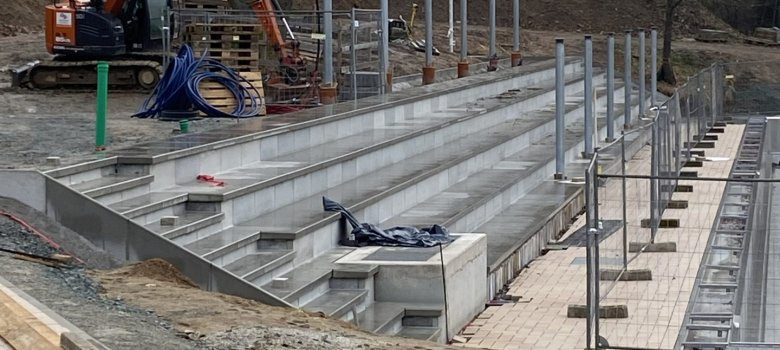Aktuell werden am Schwimmerbecken die Stützen für die neue Dachkonstruktion über den Sitzstufen aufgestellt. Sie werden mit sogenanntem Schwellbeton verankert. Damit dieser dauerhaft tragfähig aushärten kann, braucht es mehrere Tage und Nächte mit Temperaturen über 5 Grad Celsius. Die Wetterprognosen stimmen uns hier optimistisch: Ab der kommenden Woche sind passende Bedingungen in Sicht.